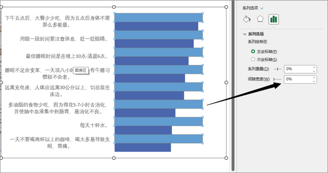 4.选择图表的条形部分,将间隙宽度调整到0,让图表看上去更加饱满.