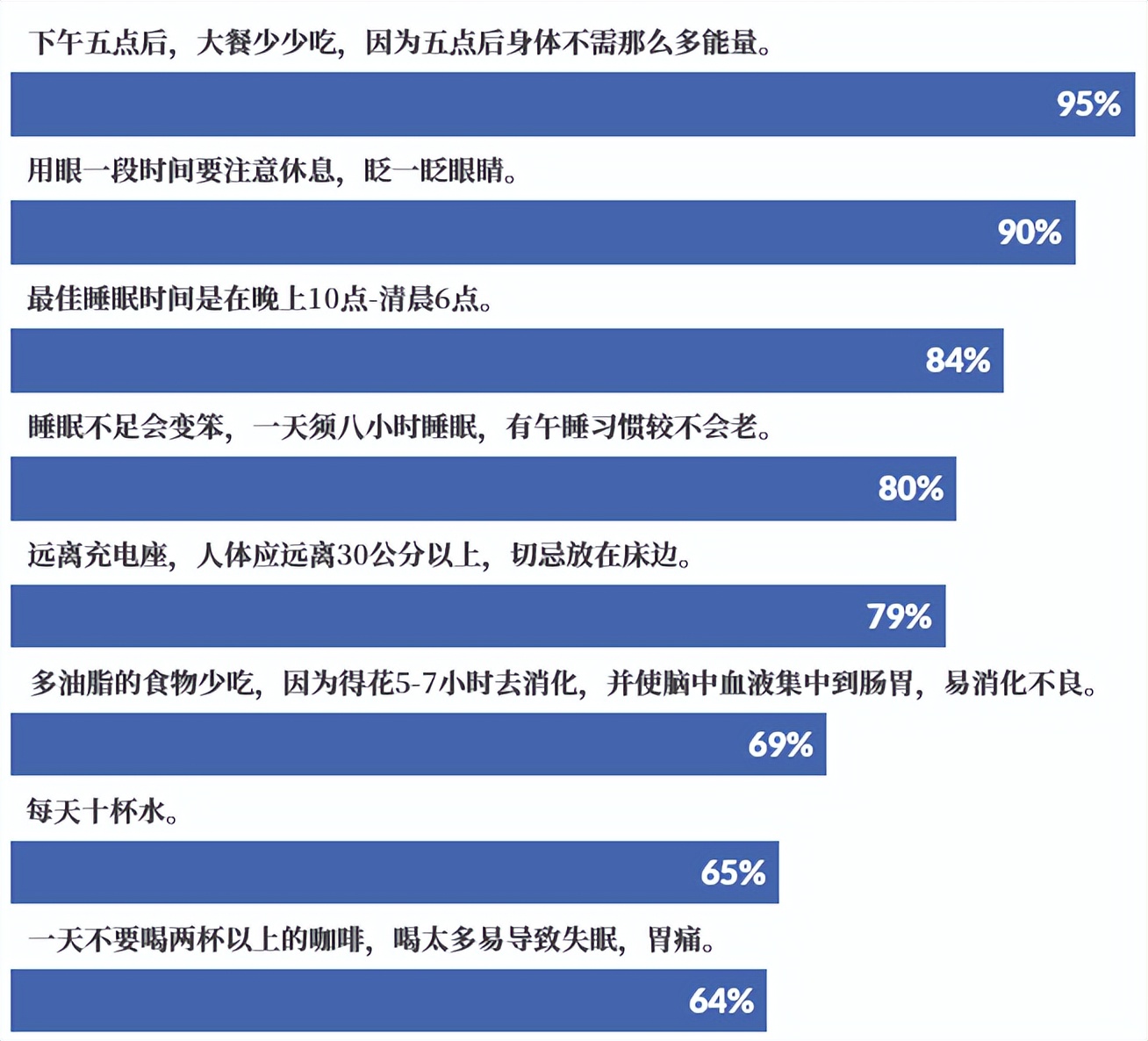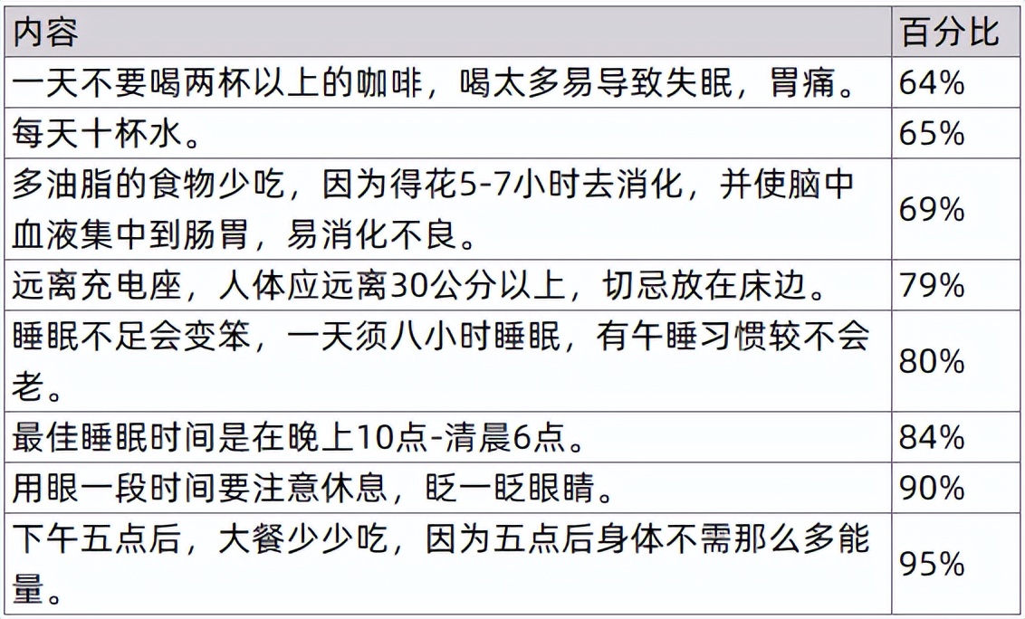 我们对一部分人群做了一个调研,关于健康问题的人群知晓的百分比调查,如下面这个表格,