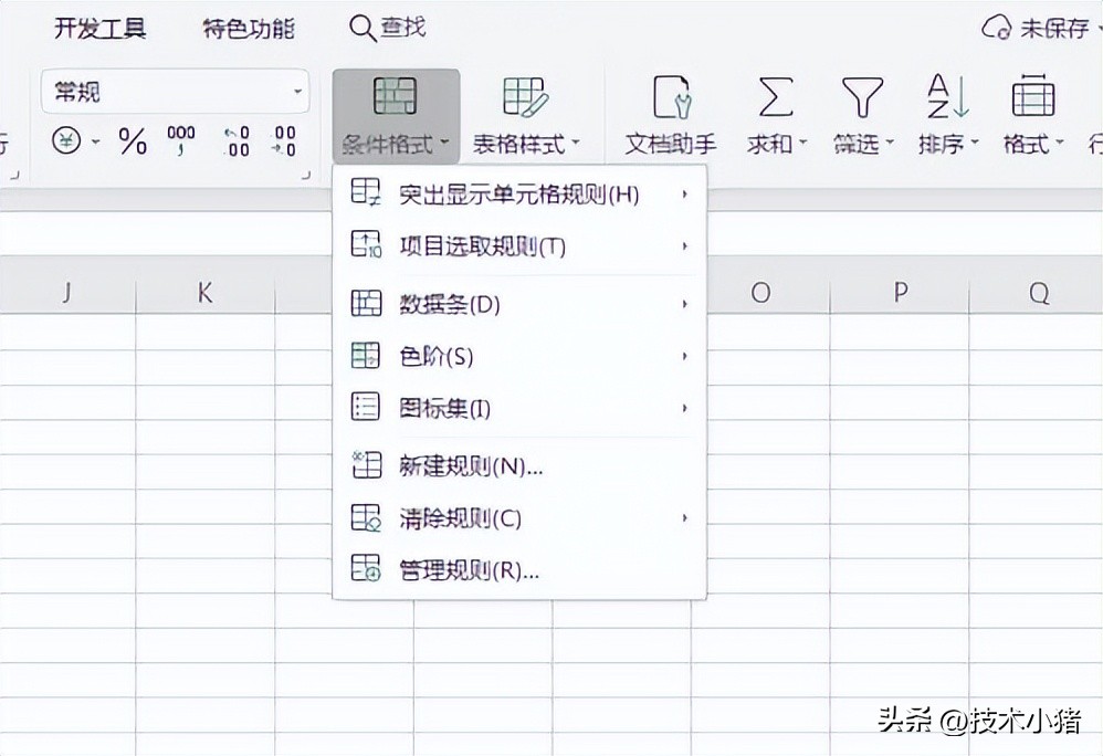 接下来,在开始菜单的功能区右侧中找到“条件格式”项目,点击条件格式项目弹出下拉菜单 项。