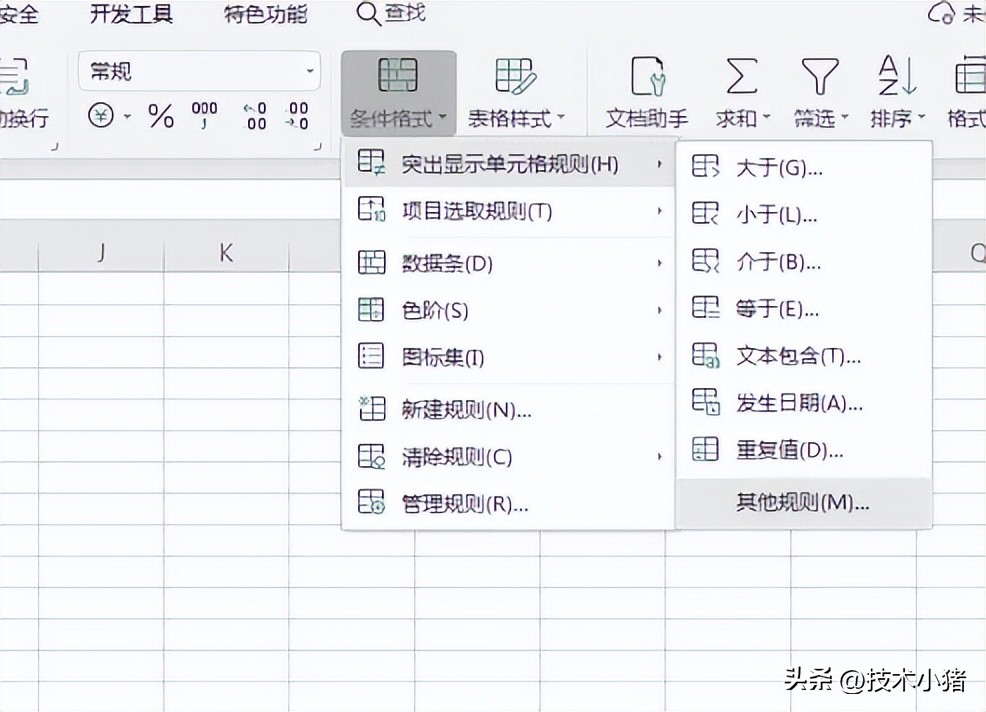 在条件格式的下拉菜单中点击“突出显示单元格规则”,在向右弹出的子菜单中再点击最后一个“其他规则”。