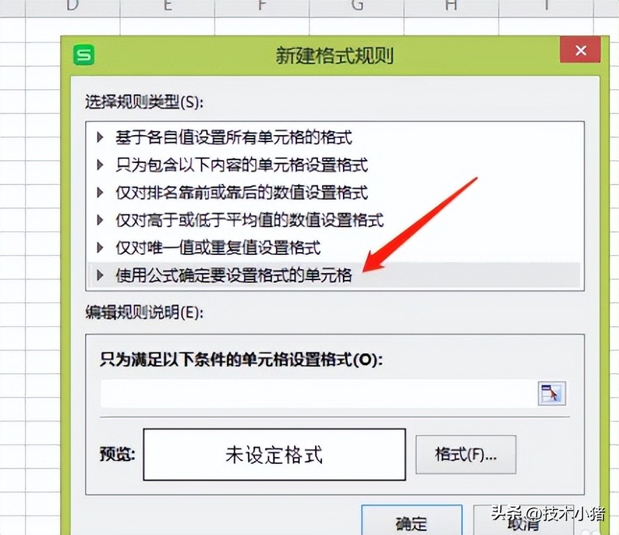 弹出新建格式规则对话框,在选择规则类型里点击最后一项“使用公式确定要设置格式的单元格”。