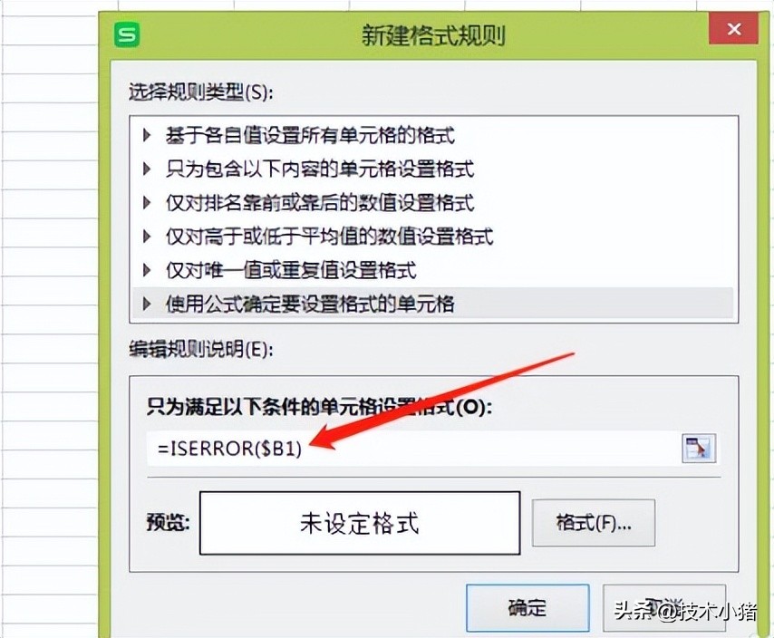 在如图5红箭头所示的文本框中输入检测错误值的函数“=ISERROR()”,然后在函数的括号里填入要检测的区域,那么我这里是要检测整个B列数据,所以输入$B1,$代表绝对引用B列,从第1行开始。然后点击“格式”按钮。