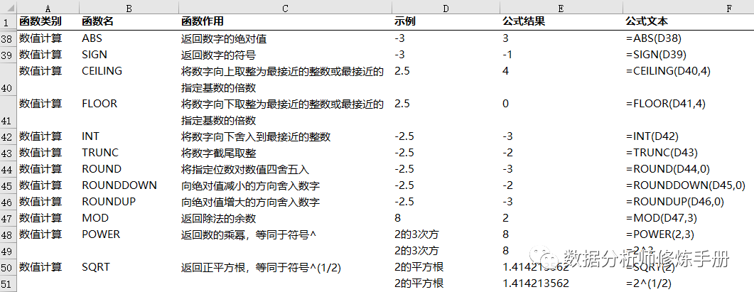 对于初学者,建议先去找类似这样的资料自学一下。本节不会去一一讲解所有函数,仅会在花少量篇幅以示例形式列举简单常用函数的用法之后,讲解数据分析中常用的函数用法。