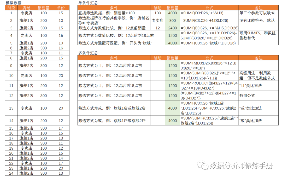 下面这张图可以讲清楚常用的条件求和函数。一题多解,主要是为了拓展函数思维。如有疑问,可在评论中提出来,我看到会解答的。