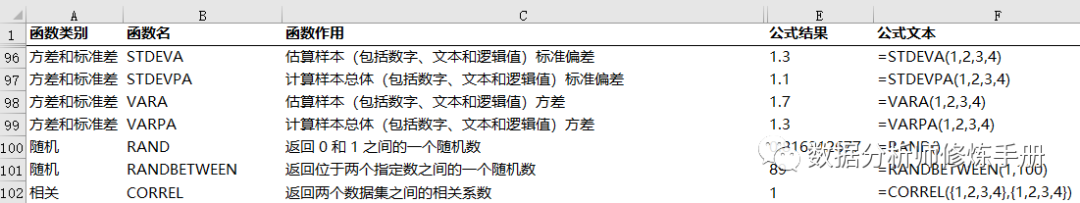 - STDEVPA:计算样本总体(包括数字、文本和逻辑值)标准偏差