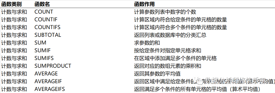 计数和求和函数主要分三组,计数、求和和平均(即求和除以计数),每组中均包含XX、XXIF和XXIFS的函数,另外求和函数还多了一个SUBTOTAL和SUMPRODUCT函数。