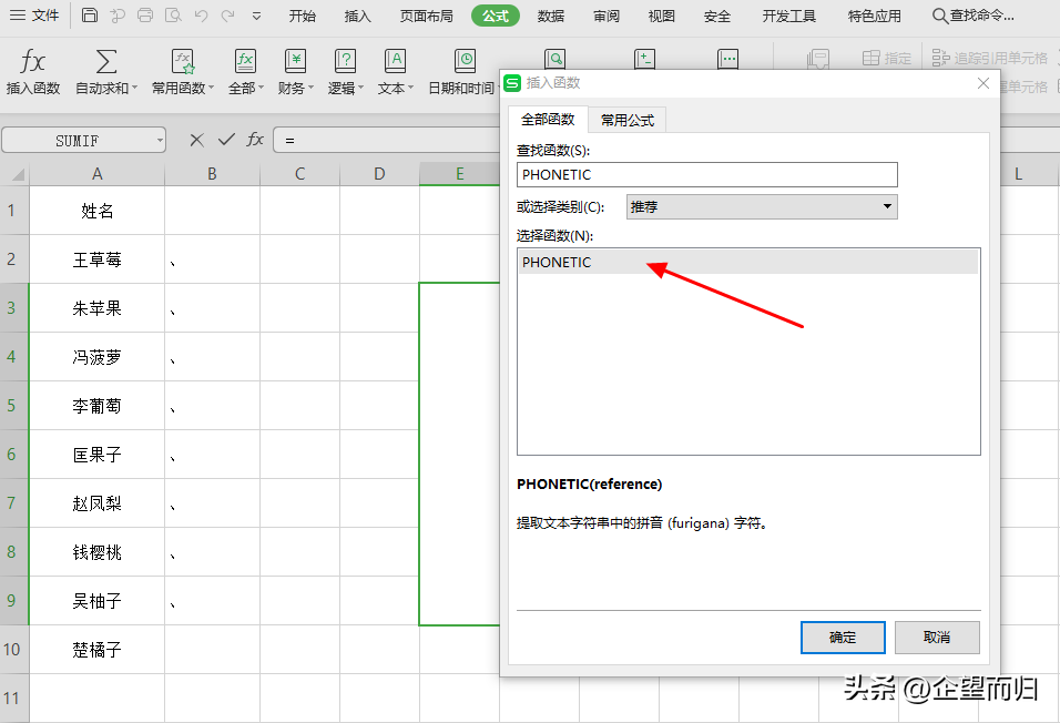 点击打开搜查出来的PHONTIC函数,PHONTIC函数对话框中我们引用A2:B10单元格,朋友们,你们学会了吗?