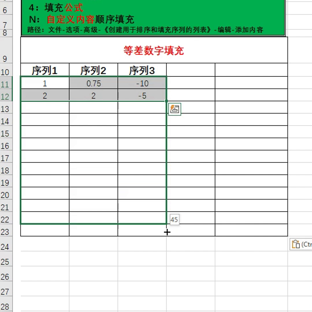 第1、等差数字填充。Excel会根据我们已填写的数字,按等差数值自动填充。我们看一下序列间的差额是一样的,这就是等差数字填充,我们接着看技巧。