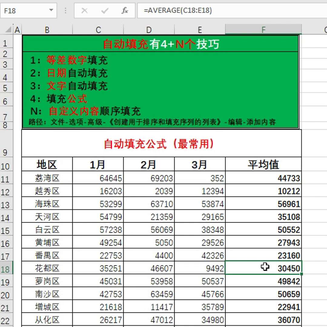 4、自动填充公式。自动填充公式是最有用的填充功能。我们看一下两个案例,案例一算平均值公式往下拖拽的时候,公式里的单元格参数会同步往下移动,这极大方便了。我们用函数公式的运用公式里面的参数,如果我们不想它平移,可以用F4键锁定功能。