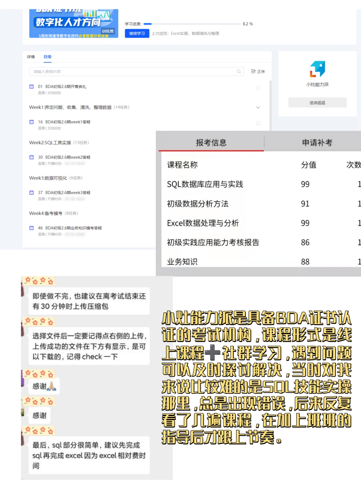 小灶能力派是BDA关方认证的机构,课程形式是线上课程社群学习,遇到问题可以及时探讨解决,当时对我来说比较难的是SQL技能实操那里,总是出现错误,后来反复看了几遍课程,再加上老师的指导后才跟上节奏。