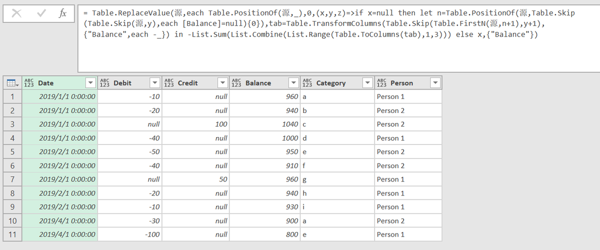 转换代码:Table.ReplaceValue(源,each Table.PositionOf(源,_),0,(x,y,z)=>if x=null then let n=Table.PositionOf(源,Table.Skip(Table.Skip(源,y),each [Balance]=null){0}),tab=Table.TransformColumns(Table.Skip(Table.FirstN(源,n+1),y+1),{"Balance",each -_}) in -List.Sum(List.Combine(List.Range(Table.ToColumns(tab),1,3))) else x,{"Balance"})