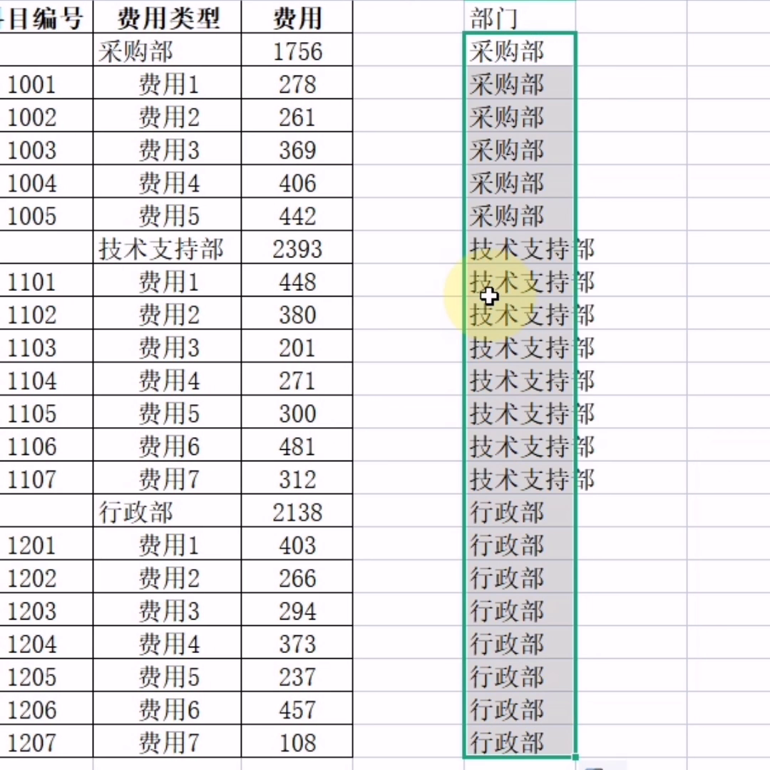 ·这个时候就引用自己写公式的单元格上一个单元格,有客户按回收键。这个时候因为科目两个字有逻辑不成,返回假字返回上面单元格。因为之前搞了什么,计算出来以后是采购部,所以依次会引用上面单元格数据。就 ok了,部门就从这种造型的一下子就转换成这种造型的了,剩下的这两个复制一下就好了,两个复制,丢到后面去做个对齐列宽调一调就好了。
