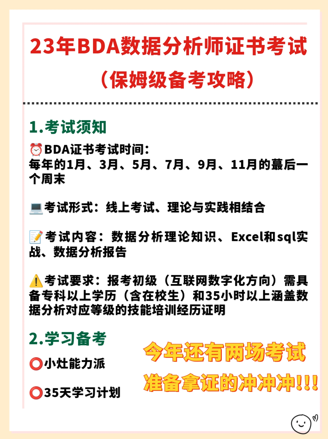 首先BDA的考试时间是每年的1月、3月、5月、7月、9月、11月的蕞后一个周末,我是在去年5月份考的,想要转行找工作的宝子可以在金三银四、金九银十的前一个月考,考到证书就能找工作啦!