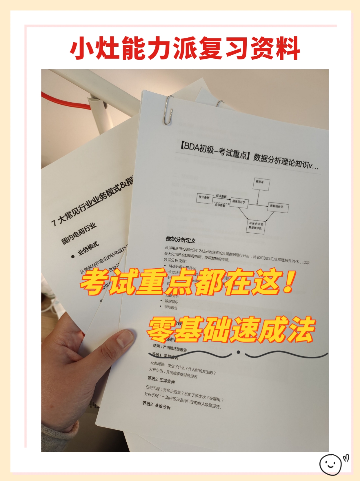 根据我的备考经历,我建议大家多温故知新,多看小灶能力派考试重点与加油包,里面有很多必考的知识点,全是干货,而且小灶能力派课程上有很多大厂的经验案例分析,在学好后能够知道数据分析流程,积累数据分析经验,还可以给简历加分!