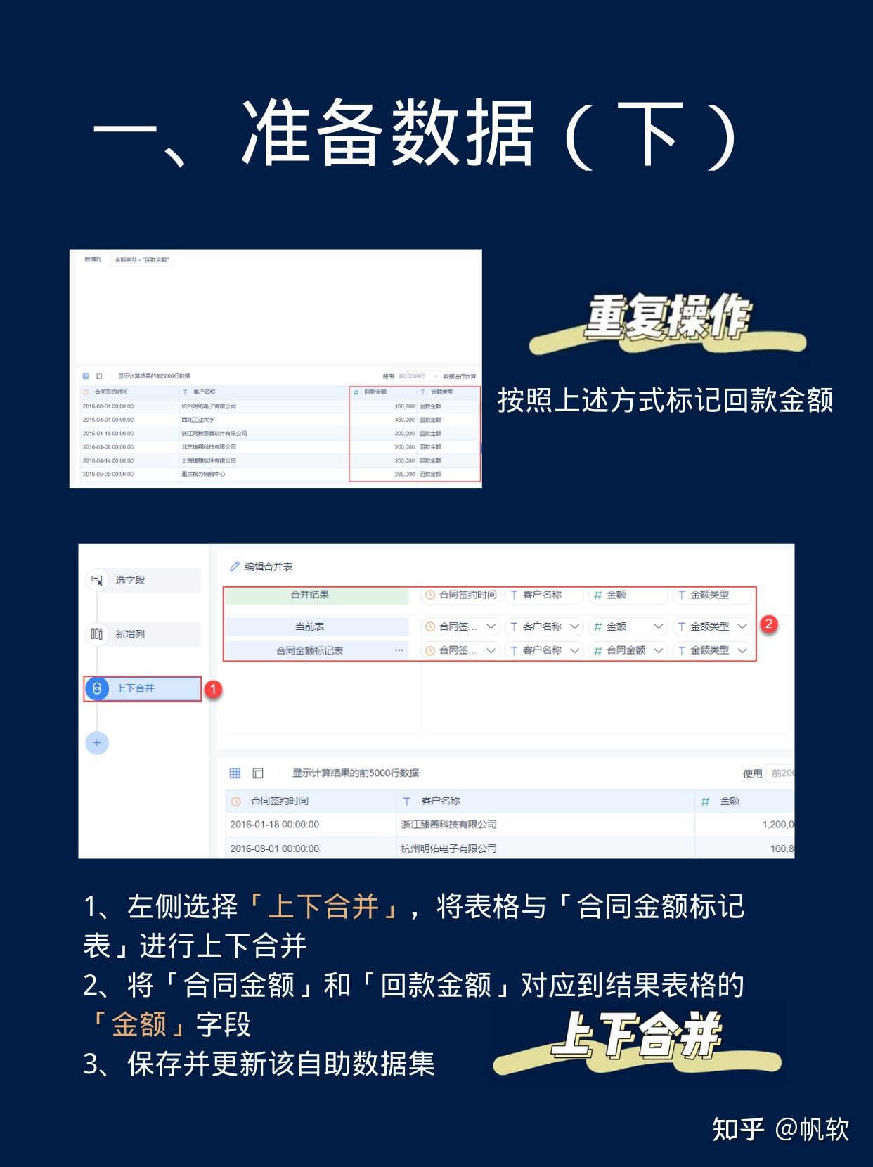 按照上述方式标记回款金额,左侧选择「上下合并」,将表格与「合同金额标记表」进行上下合并;将「合同金额」和「回款金额」对应到结果表格的「金额」字段,保存并更新该自助数据集。