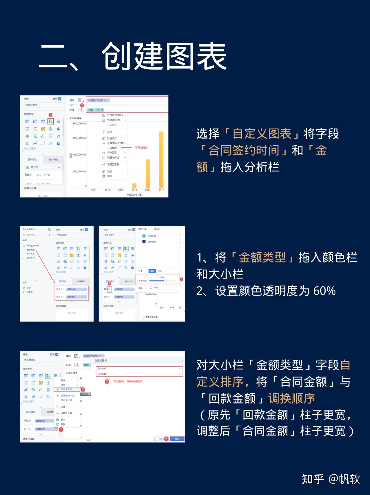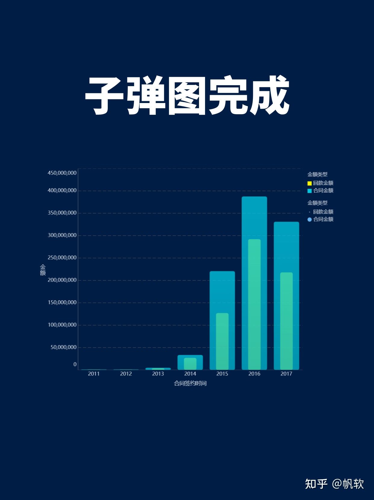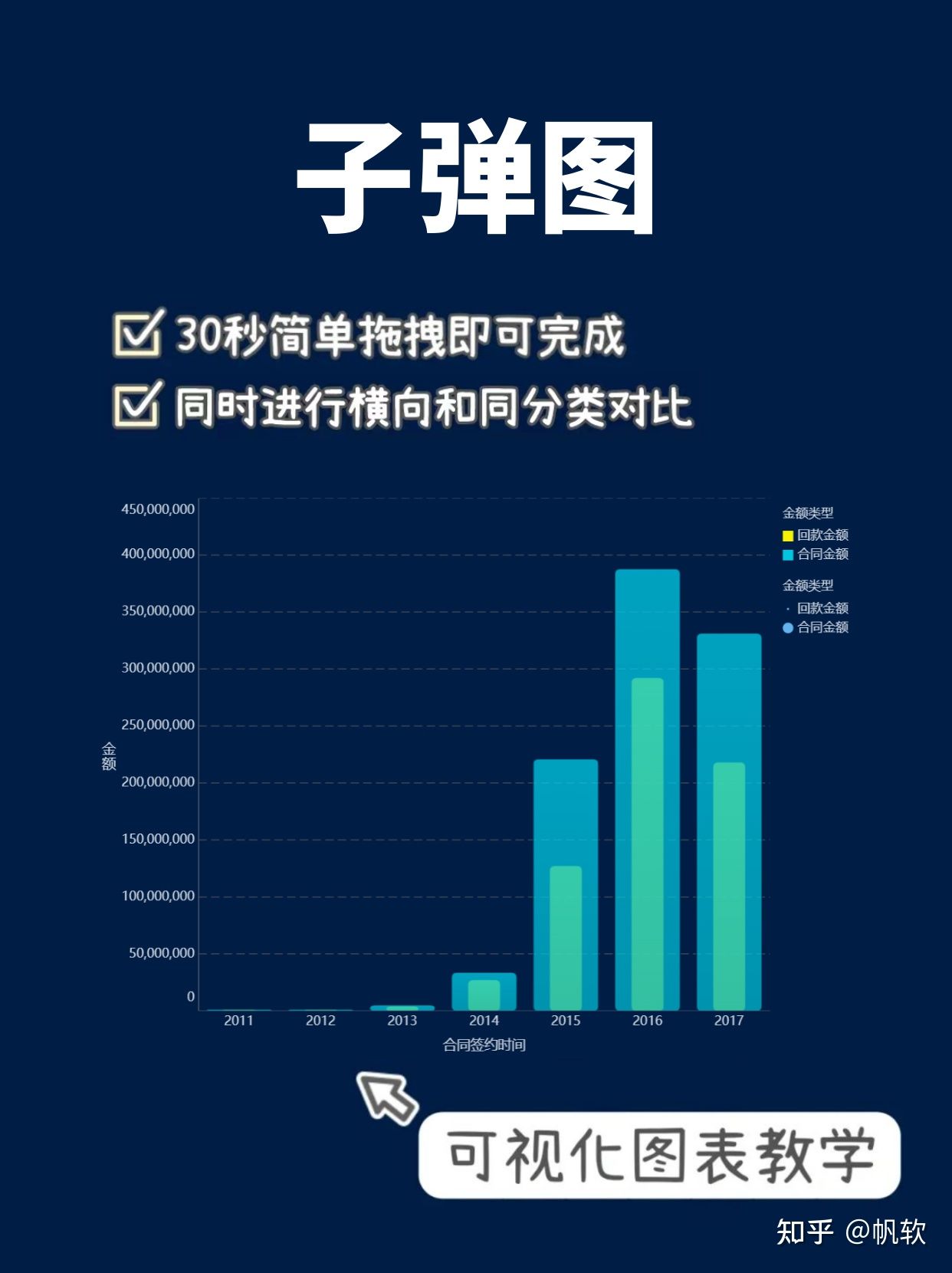 例如,我们可以对不同年份的「合同金额」「回款金额」进行比对,也可以对每年的「合同金额」与「回款金额」进行比对。