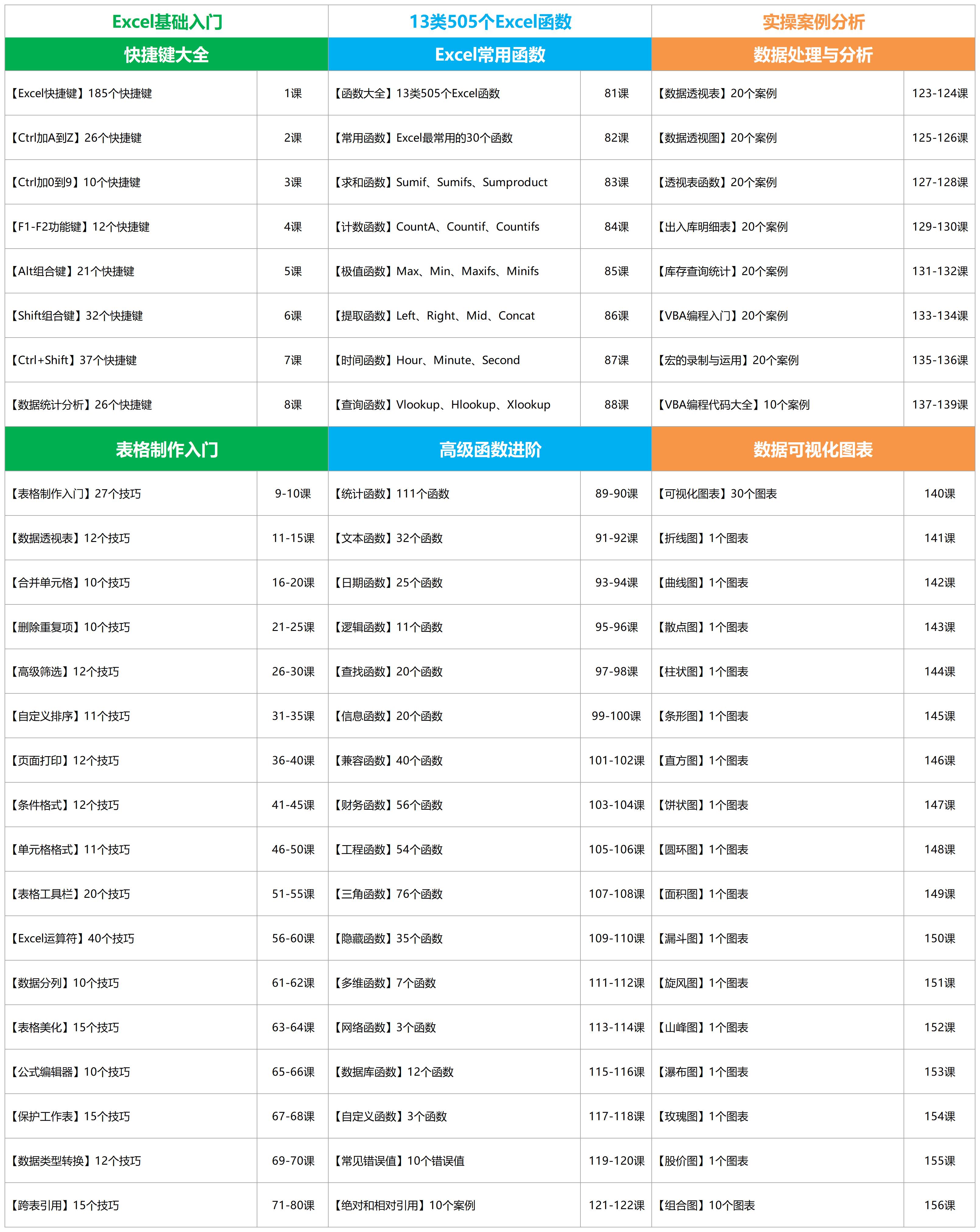 共156节课程,分为初中高三个阶段,包含了505个函数,分为13类,涵盖了各种各样的应用场景!