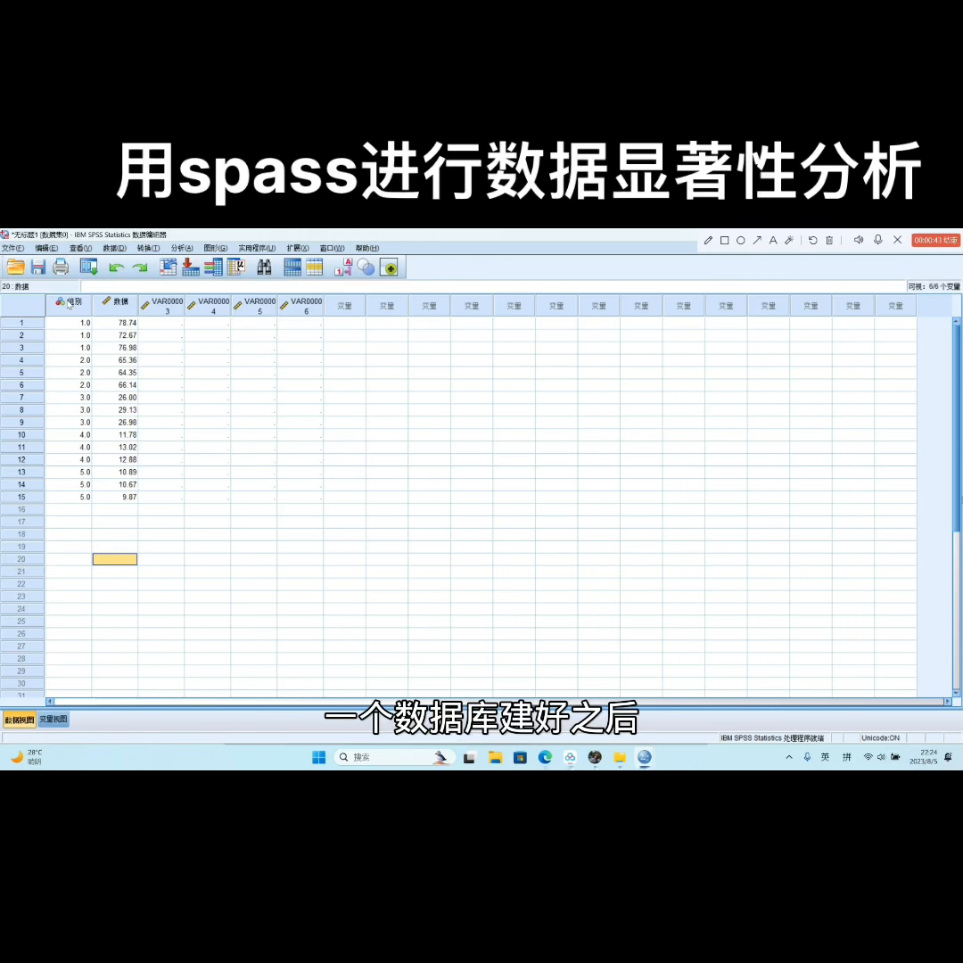 建好数据库后,选择组别和数据,点击上方的分析选项,选择单因素分检验。在这里,将组别设置为因子,数据分析为因变量列表,选择事后比较。在这里,我们选择L-邓肯和沃勒邓肯肯,一般将显著性水平设置为零点零点五。也可以根据实验数据要求进行设置,点击继续。在选项中,点击显著和方差齐性检验,点击继续,再点击确定,即可完成数据分析。