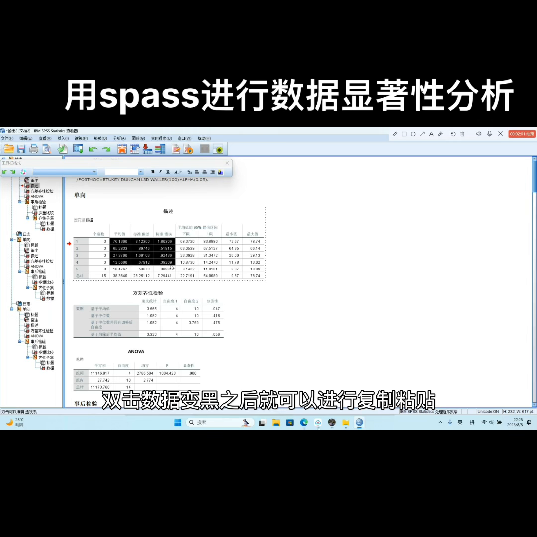 在单项中,我们可以双击更改文件名。在描述中,我们可以分析第一组、第二组和第五组数据的特征。在暗数中,我们可以得到三个平均数的标准差、偏差标准误差上限、下限和最小值和最大值。这些数据可以通过Excel生成,双击数据并选中后,即可复制和粘贴数据。