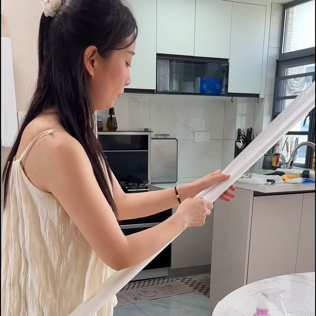 ·接着在桌子表面均匀喷上洗洁精水,撕掉保护膜的底纸,同时给保护膜的带胶面喷上洗洁精水,以防膜之间粘连。