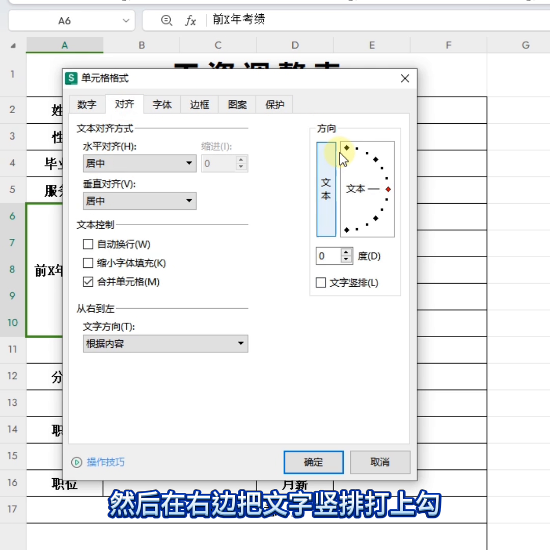 ·调好之后需要把这个单元格的文字调为竖排。选中单元格按右键,点击设置单元格格式,点击对齐。然后在右边把文字竖排打上勾,点击确定,文字就变成竖排了。