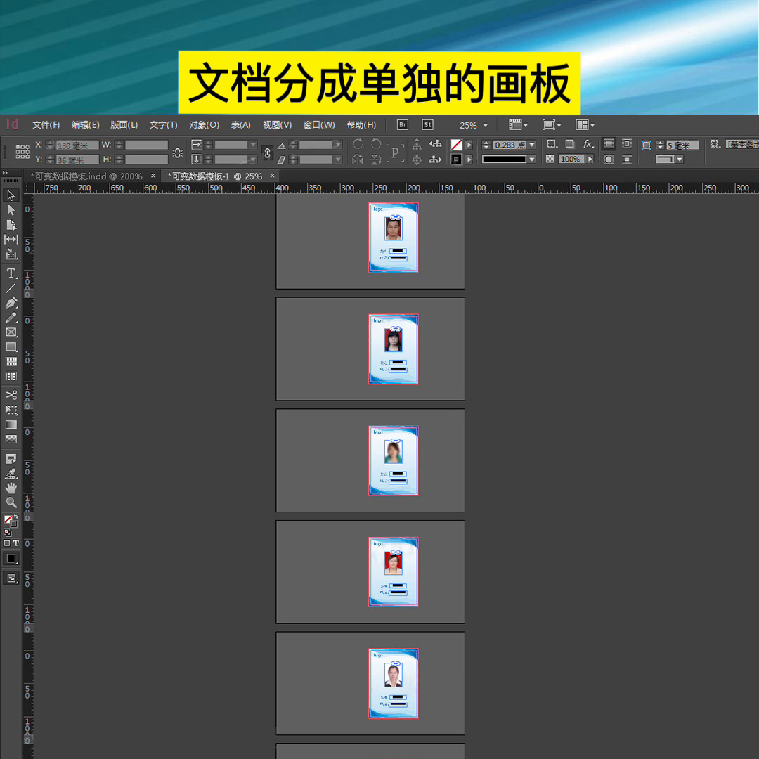 2、在ID中制作工作证模板,导入可变数据表格,完成可变数据快速导入生成PDF文件:在PDF中拼版输出打印。