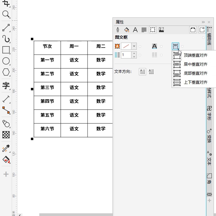 ·现在,我们可以看到文字已经快速转换为表格形式,我们可以拖动表格边框让文字显示出来。但是,此时文字和图形的单元格并没有居中对齐。选择表格,打开“文本变速”面板,选择“段落”选项,然后选择“居中”。