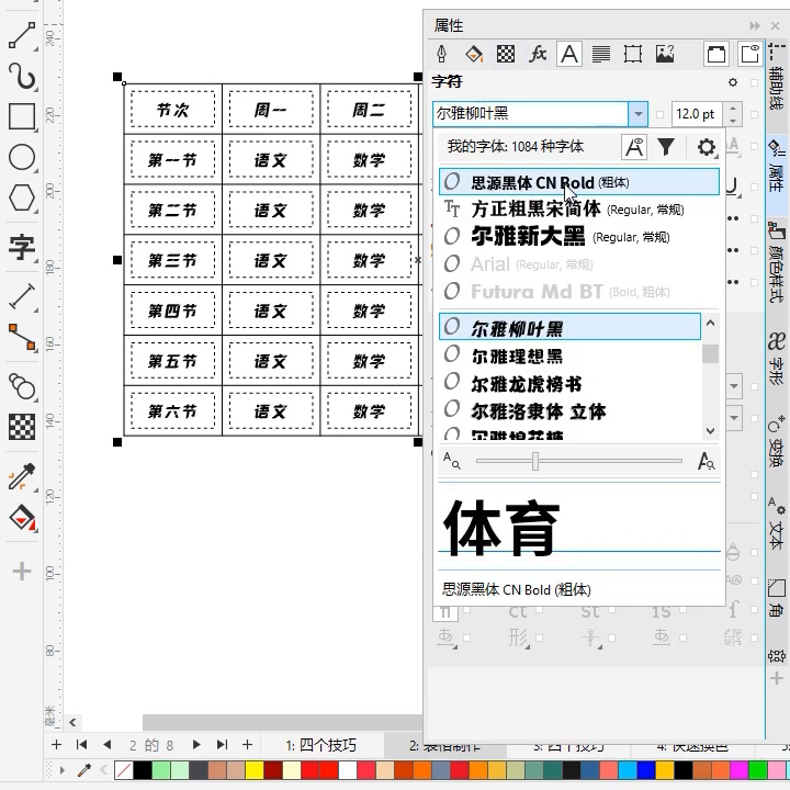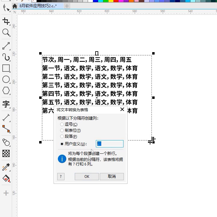今天我们来学习如何使用CDR制作课程表格。在制作表格之前,我们需要先将表格中的文字用逗号分开,并整理好文本内容进行复制,然后粘贴到CDR中。使用段落文本格式。