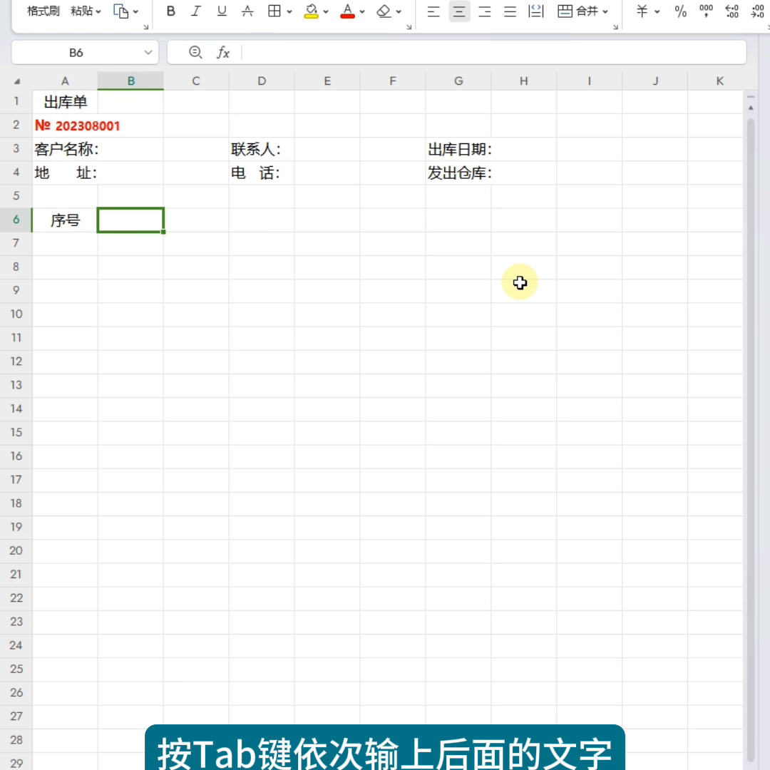 ·然后选中这个单元格,点击开始菜单,点击B给文字加粗,点击字体颜色为红色,点击左对齐。接着鼠标框选数字,把字号调小。把光标放到下面单元格,输上客户名称冒号。然后按两下Tab键,输上联系人冒号,按两下Tab键,输上出库日期冒号。把光标放到客户名称下面,输上地址,在联系人下面输上电话,在出库日期下面输上发出仓库。
