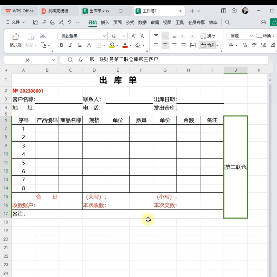 ·把光标放到右边单元格,输上第一联、财务、第二联、仓库、第三联、客户。然后选中单元格仪表格平齐,点击合并居中。按Ctrl+1调出单元格格式,选中对齐。在右边把文字竖排打上勾,点击确定。把这个列宽拉窄,选中单元格以后点击A,把字号调小,再把光标放到财务的后面敲打空格,仓库的后面敲打空格。框选右上角这两个单元格,点击合并居中,在这里打上销售员。