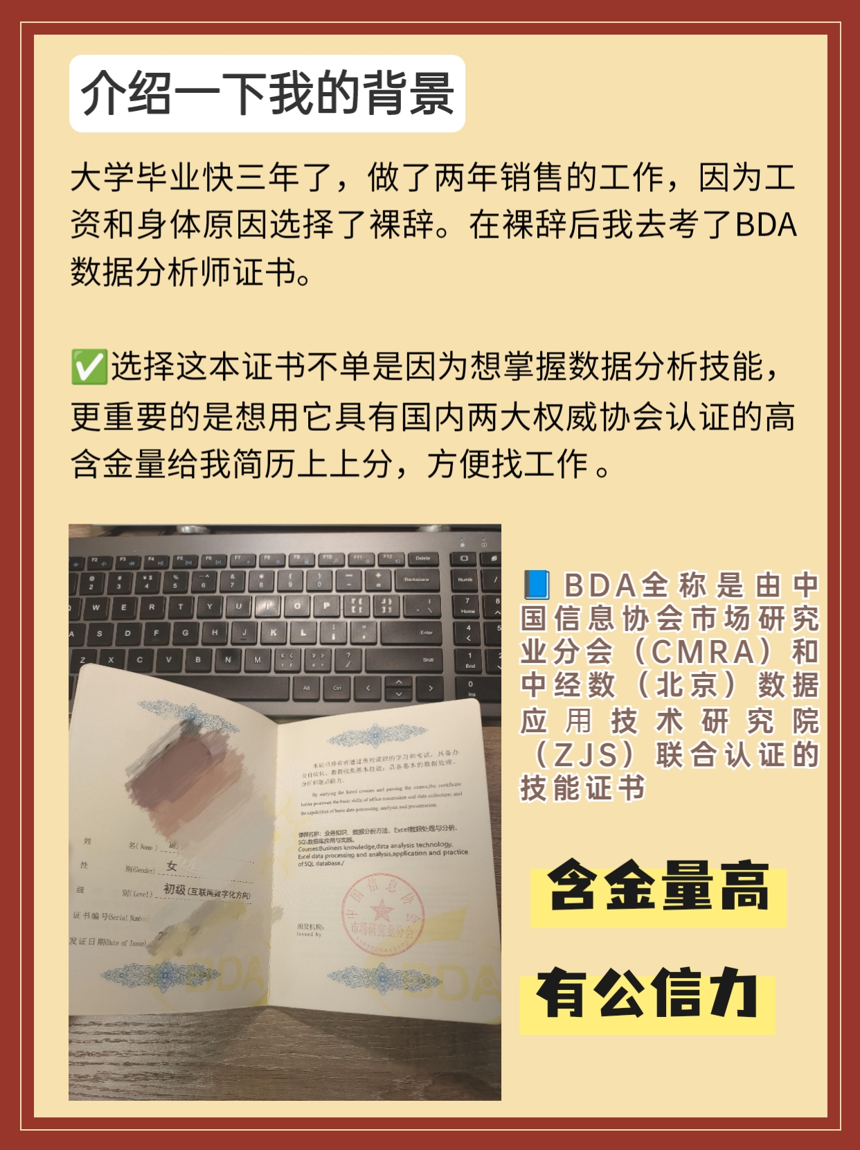 我大学毕业快三年了,做了两年销售的工作,因为工资和身体原因选择了裸辞。在裸辞后我去考了BDA数据分析师证书。选择这本证书不单是因为想学会Excel、sql等数据分析技能,更重要的是想用它具有国内两大权威协会认证的高含金量给我简历上上分,方便找工作 !后来也就是这本证书帮我转行做了数据分析师,工资也比做销售时高了3k。