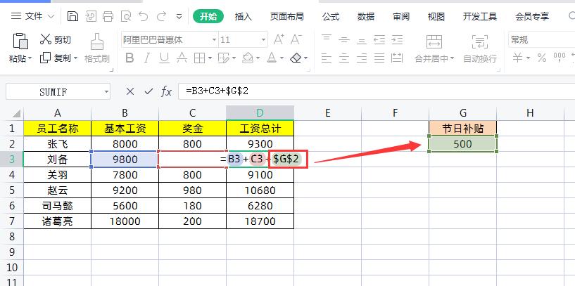 如果我们直接使用公式=B2+C2+G2,我们会发现只有第一行的数据加上了节日补贴,其他行并没有。这是因为引用了相应的空白单元格,而真正的节日补贴单元格只是G列的第2行(G2)。