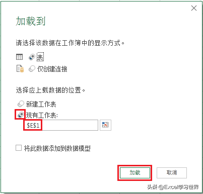 6. 在弹出的对话框中选择“现有工作表”,指定需要上传的位置 --> 点击“加载”
