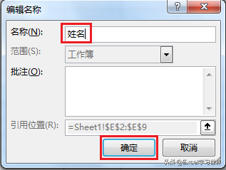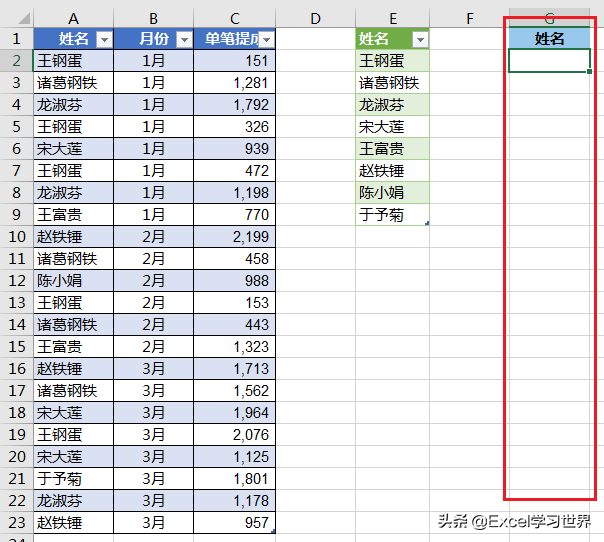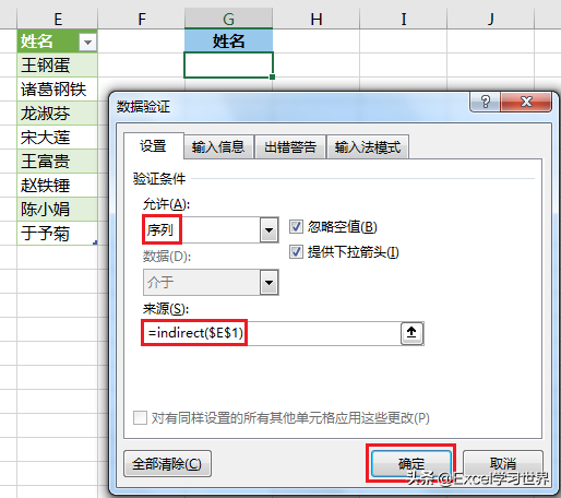 - =INDIRECT($E$1) 在这里也可以写成 =INDIRECT("姓名"),即引用名称为“姓名”的列表内容,也就是绿色区域的人名