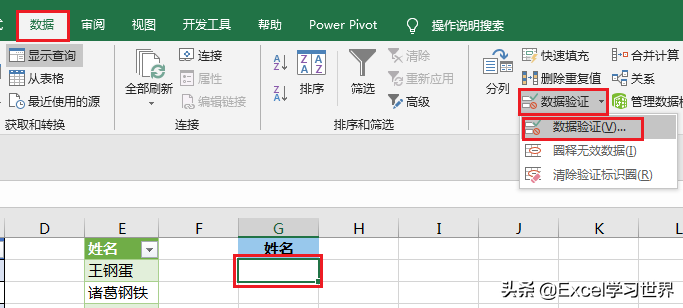 10. 选中 G2 单元格 --> 选择菜单栏的“数据”-->“数据验证”-->“数据验证”