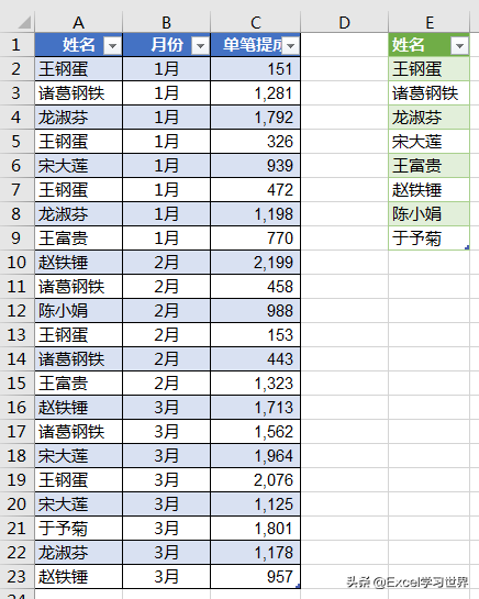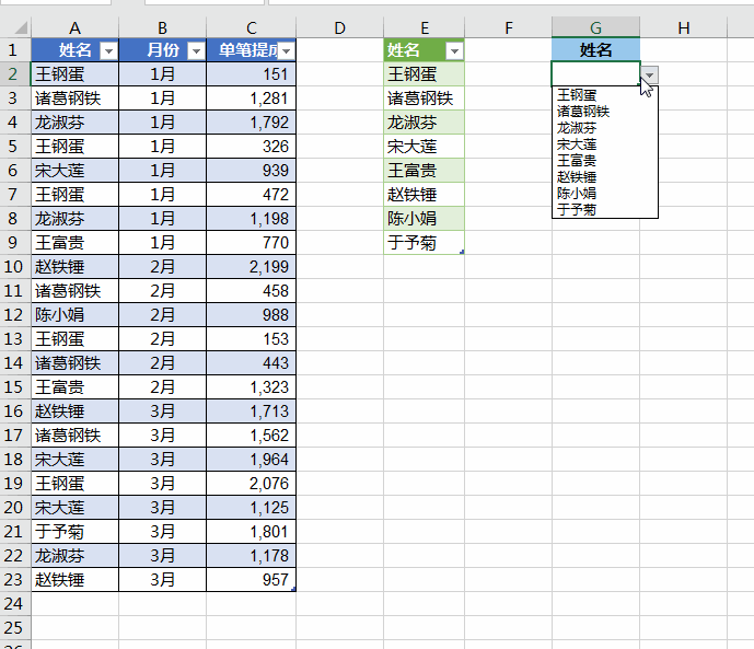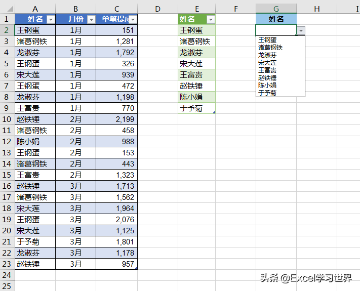 无论在 A 列增加或删除姓名,只要在 E 列刷新一下,下拉菜单的内容就会实时更新。