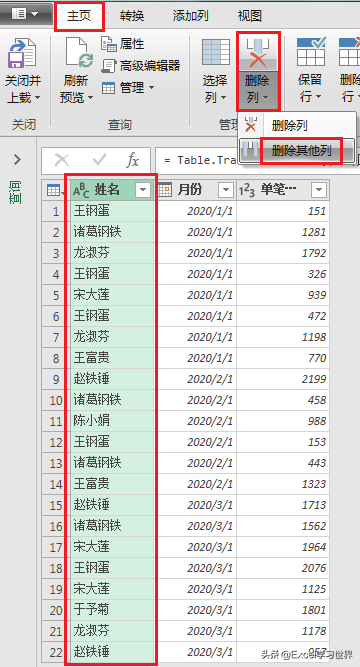 3. 选中“姓名”列 --> 选择菜单栏的“主页”-->“删除列”-->“删除其他列”