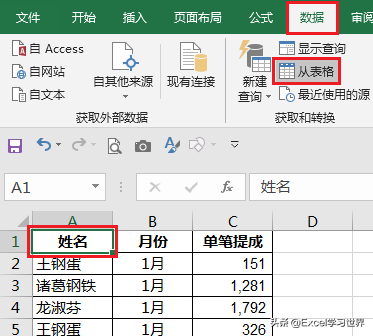 1. 选中数据表的任意区域 --> 选择菜单栏的“数据”-->“从表格”