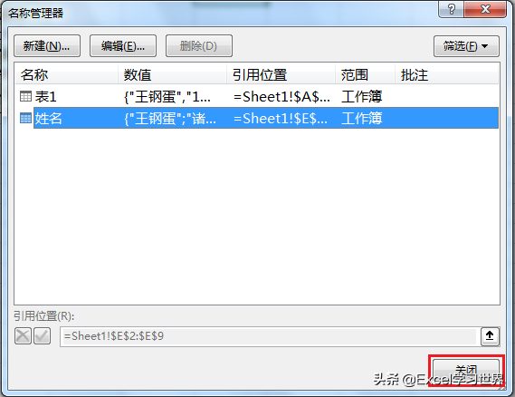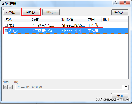 7. 按 Ctrl+F3 --> 在弹出的“名称管理器”对话框中选中“表1_2”,即绿色区域的表 --> 点击“编辑”