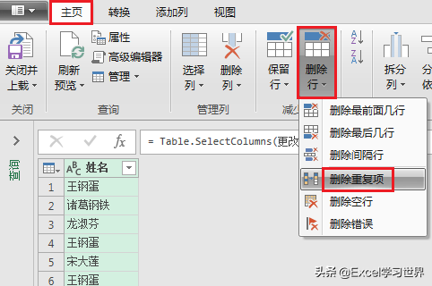 4. 选择菜单栏的“主页”-->“删除行”-->“删除重复项”