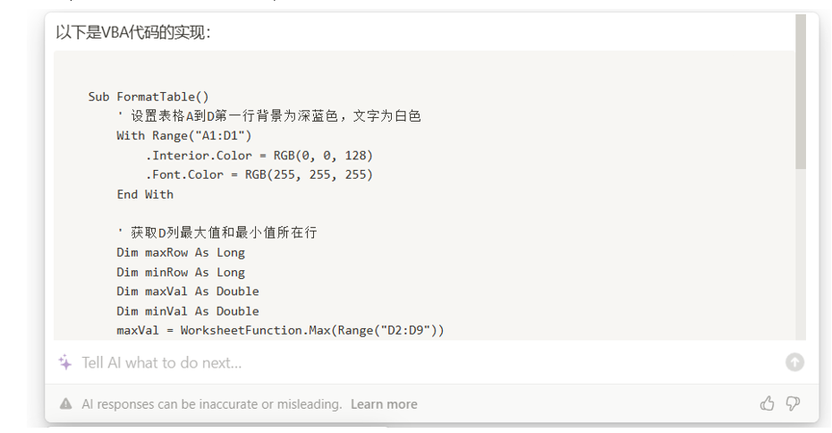 于是,我问GPT:“请写一段VBA代码,把表格的标题行生成蓝色底纹白色字体,就业率最高的一行生成红色底纹白色字体,就业率最低的一行生成黄色底纹。”如下图: