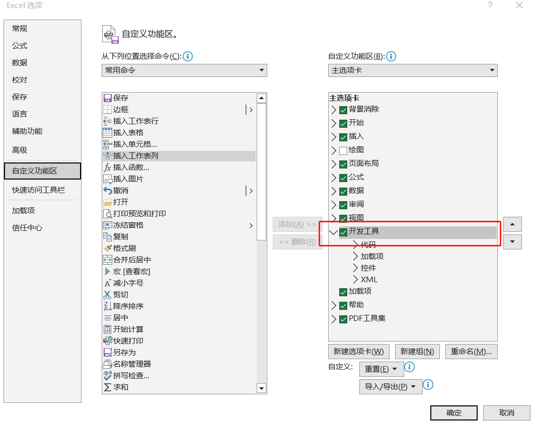 如果你的EXCEL里没有看到“开发工具”的选项,可以在EXCEL中依次点击“文件-选项-自定义功能区”,调出“开发工具”,如下图:
