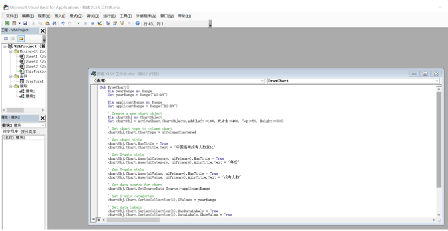 此时,我想将报考人数生成“柱状图”,我接着问“请写一段VBA代码,以柱状图的形式反映上述表格中各年份对应的报考人数情况”。
