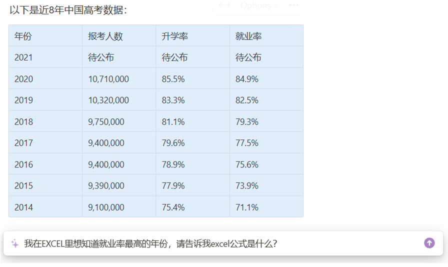 此时,我想知道就业率最高是哪一年,于是我接着询问“我在EXCEL里想知道就业率最高的年份,请告诉我EXCEL的计算公式”