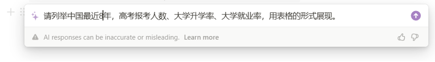 我询问“请列举中国最近8年,高考报考人数、大学升学率、大学就业率,用表格的形式展现”。此时,GPT瞬间就用表格形式输出内容。