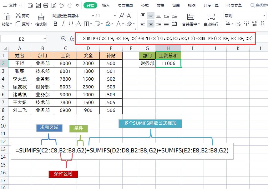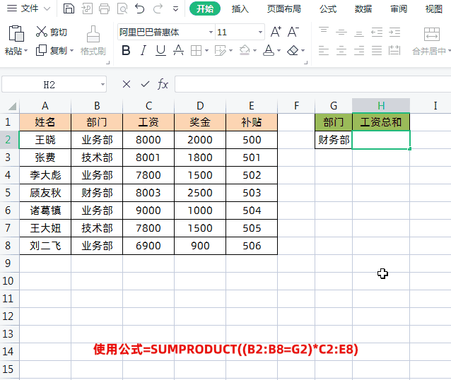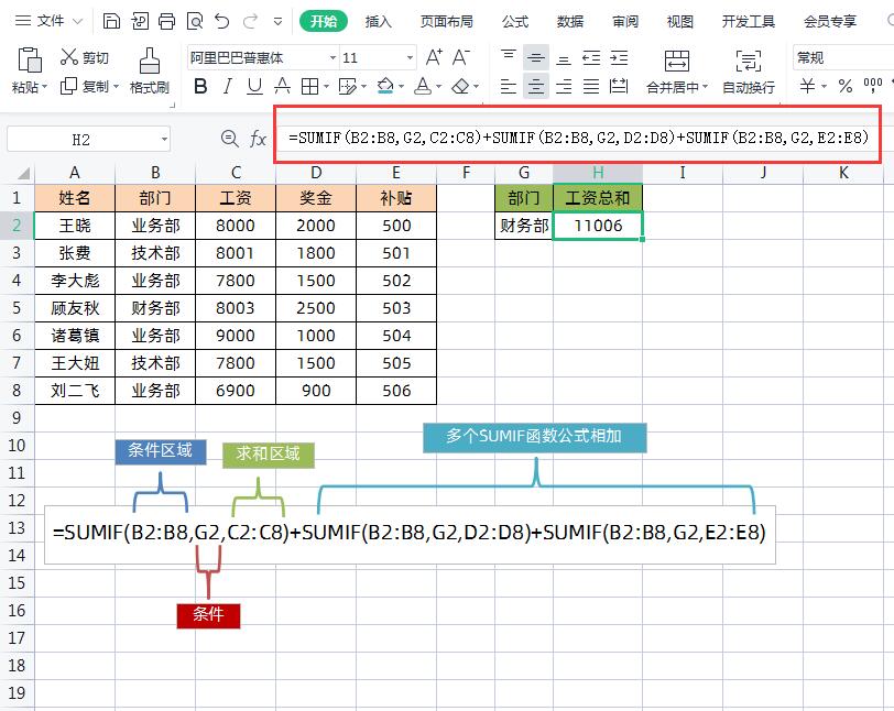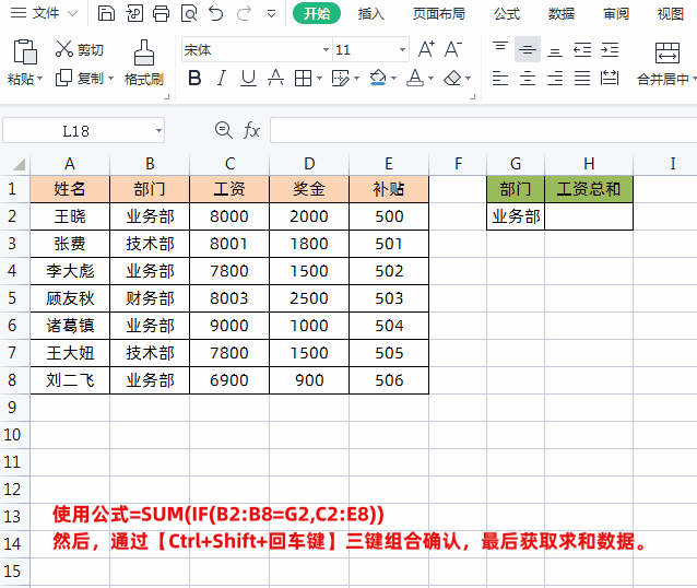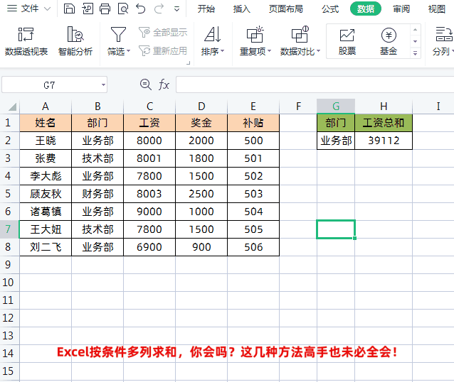 如下图所示,左侧表格是员工工资明细表,右侧是根据部门计算工资总和。求和条件就是B列的“部门”,求和区域就是C、D、E三列(工资、奖金、补贴)。