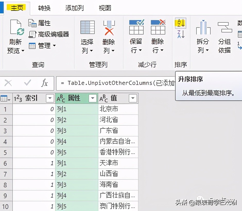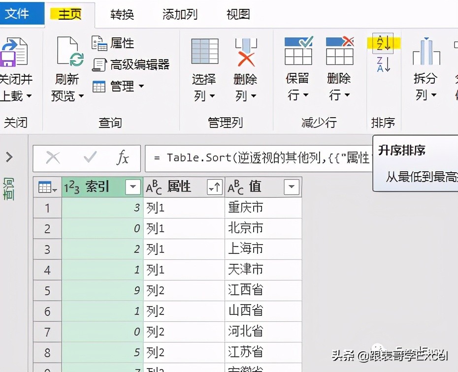 首先选中“属性”列,然后在“主页”选项卡下点击“排序”(升序):