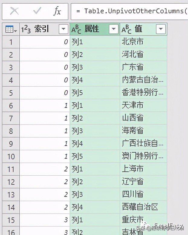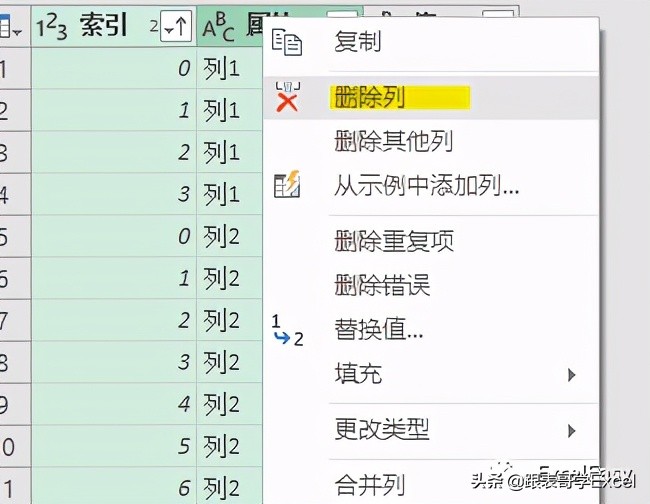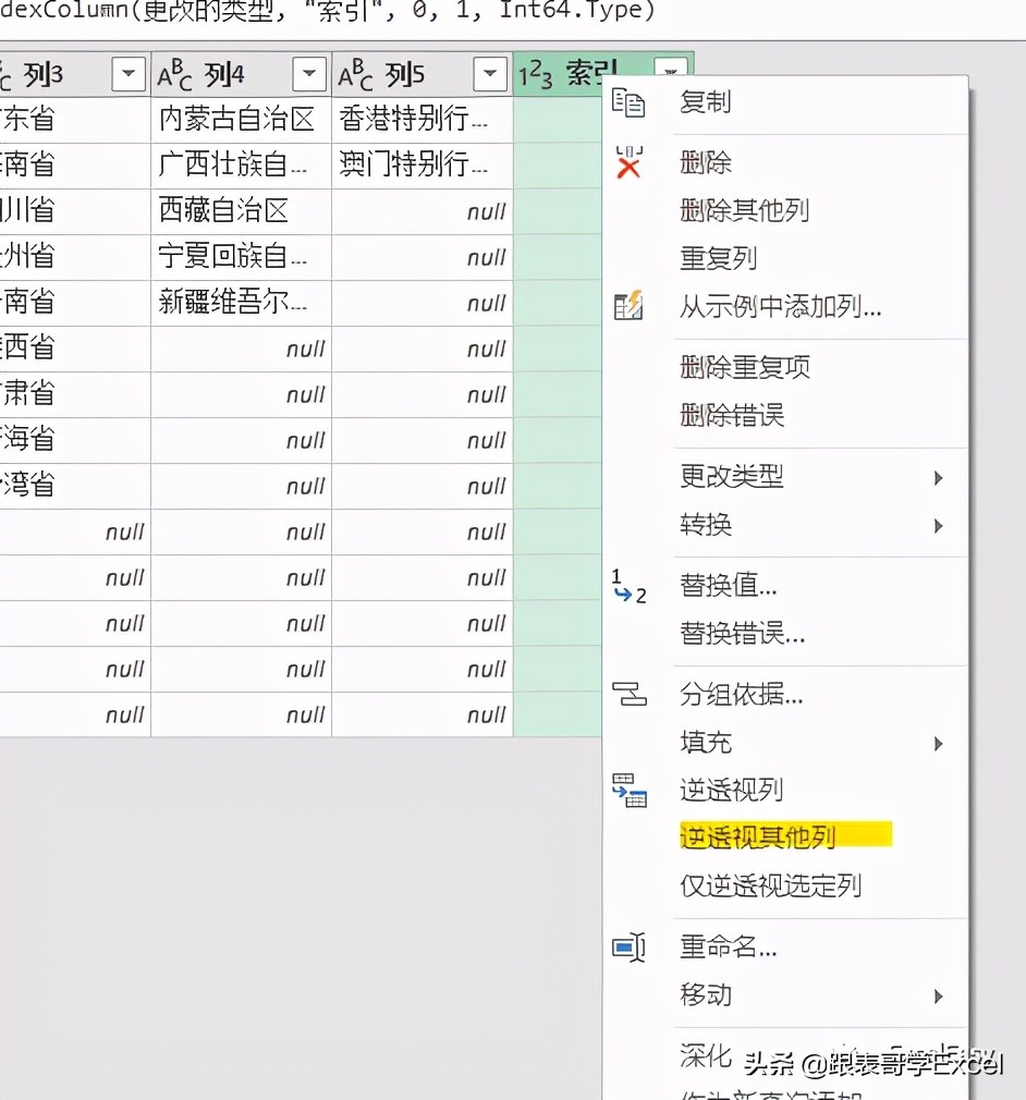 3.选中索引列,点击鼠标右键,在菜单中选择“逆透视其他列”: