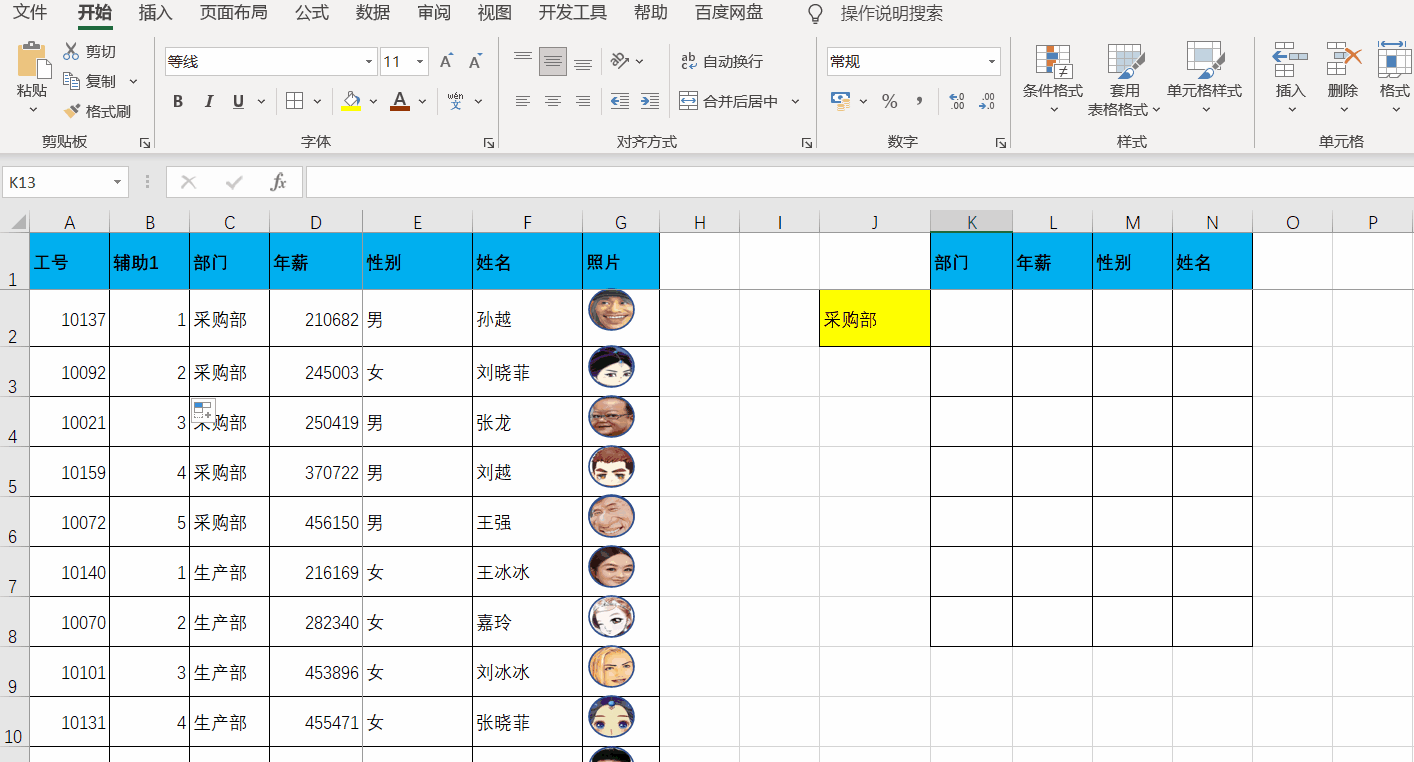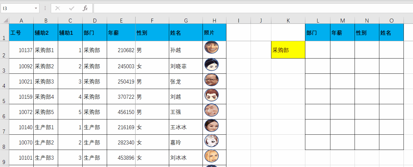3.同第一种方案,创建唯一查询条件。在K2输入“采购部1”, 然后向下拖拉,就创建了多条唯一数据。