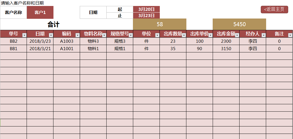 最后介绍进销存板块,这个板块包含出、入库单号查询,收、付款明细表,应收、付统计表六各表格,除收、付款明细表需您依次录入外,其余表格只需填写单号、供应商或客户名称,相关数据即可自动生成。